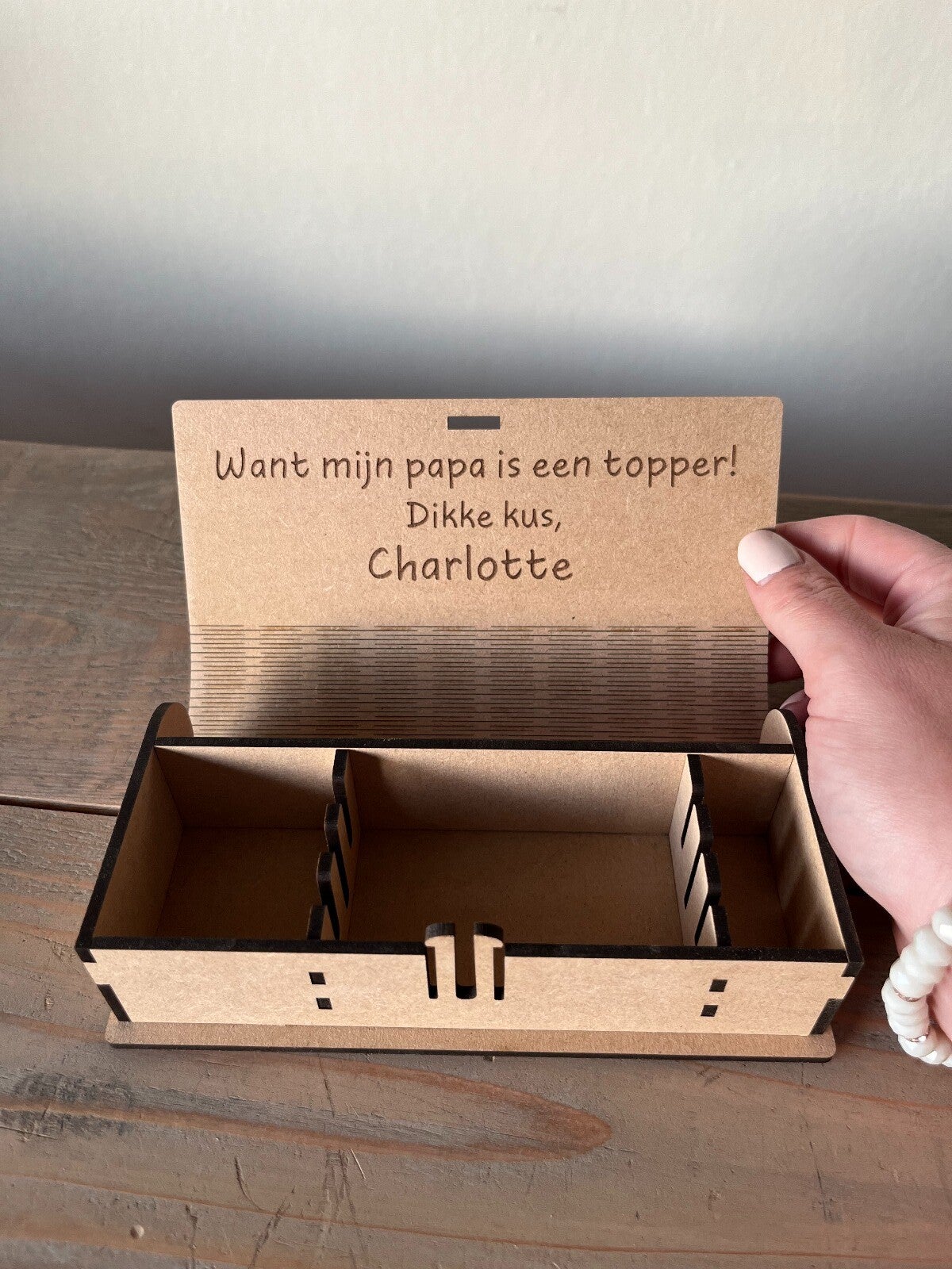 De binnenzijde van het doosje kan voorzien worden van een persoonlijke boodschap, logo of afbeelding. Tekst kan je doorgeven via het tekstvakje, een logo of afbeelding mail je even door.