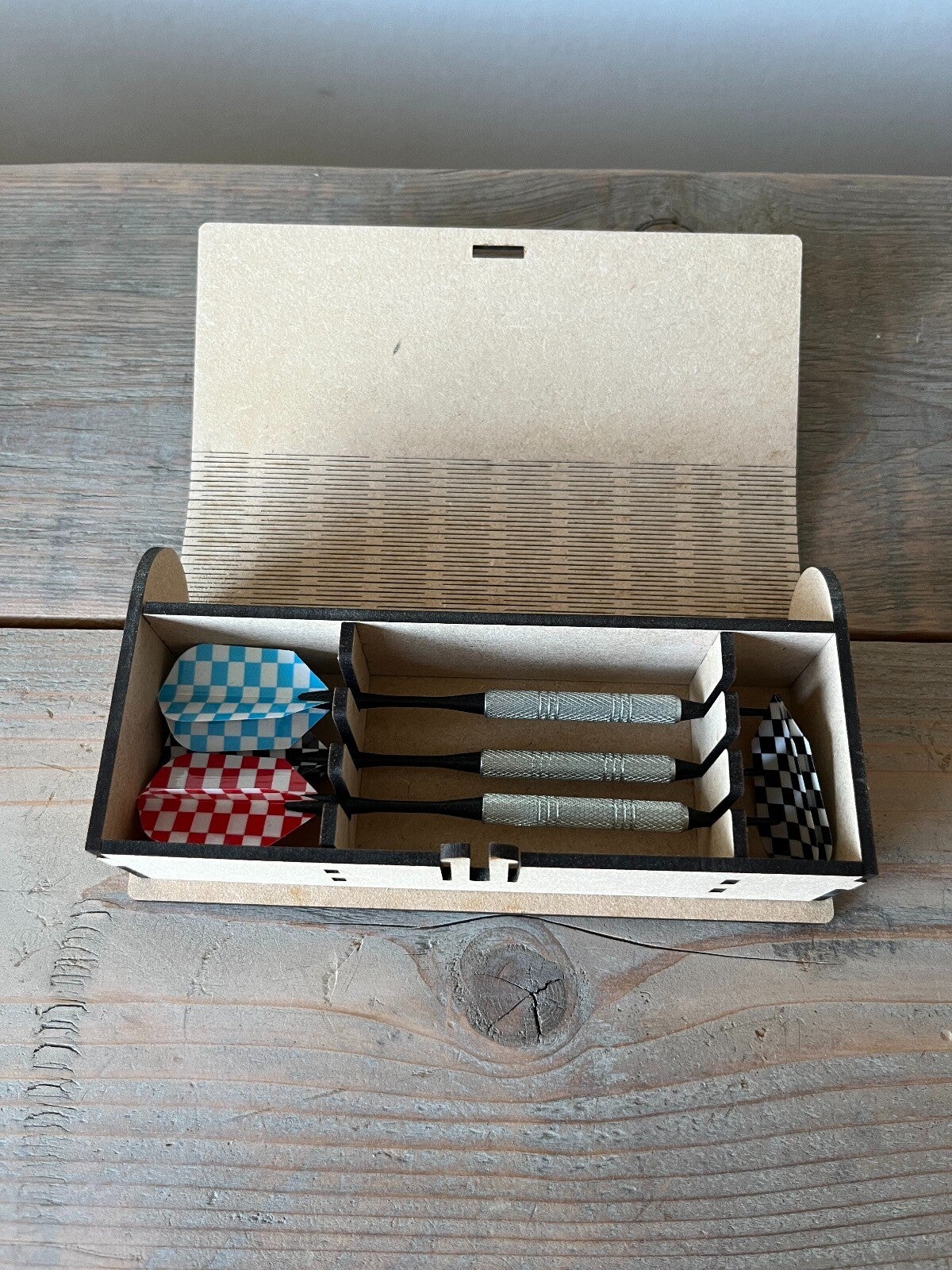 Houten doosje om dartpijlen in op te bergen.