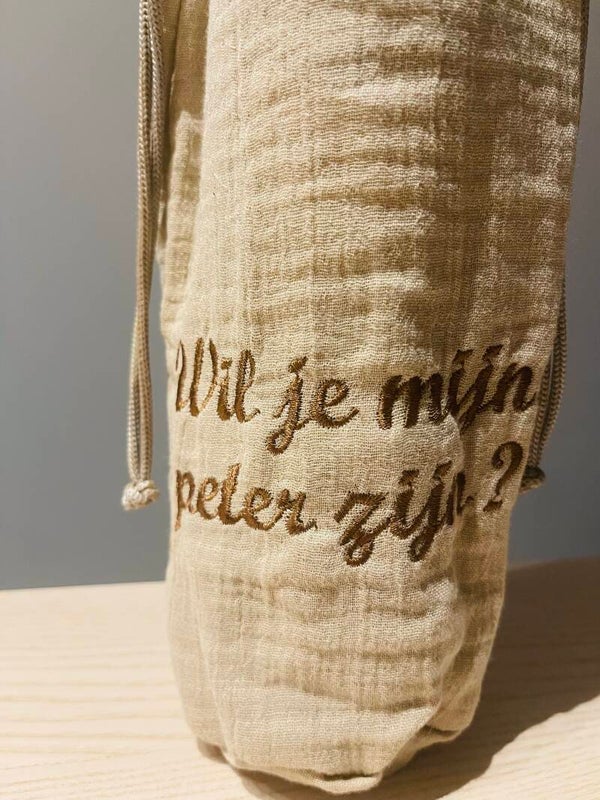 Met deze leuke zak stel je een speciaal persoon de mooie vraag om peter te worden van je kindje.