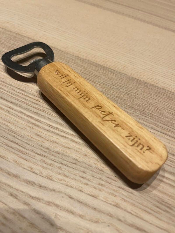 Leuke houten flessenopener om de peter van je kindje te vragen.