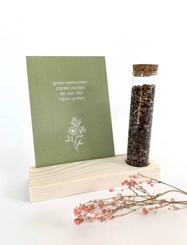 Prachtig houten plankje met kaartje en buisje met weidebloemzaadjes.